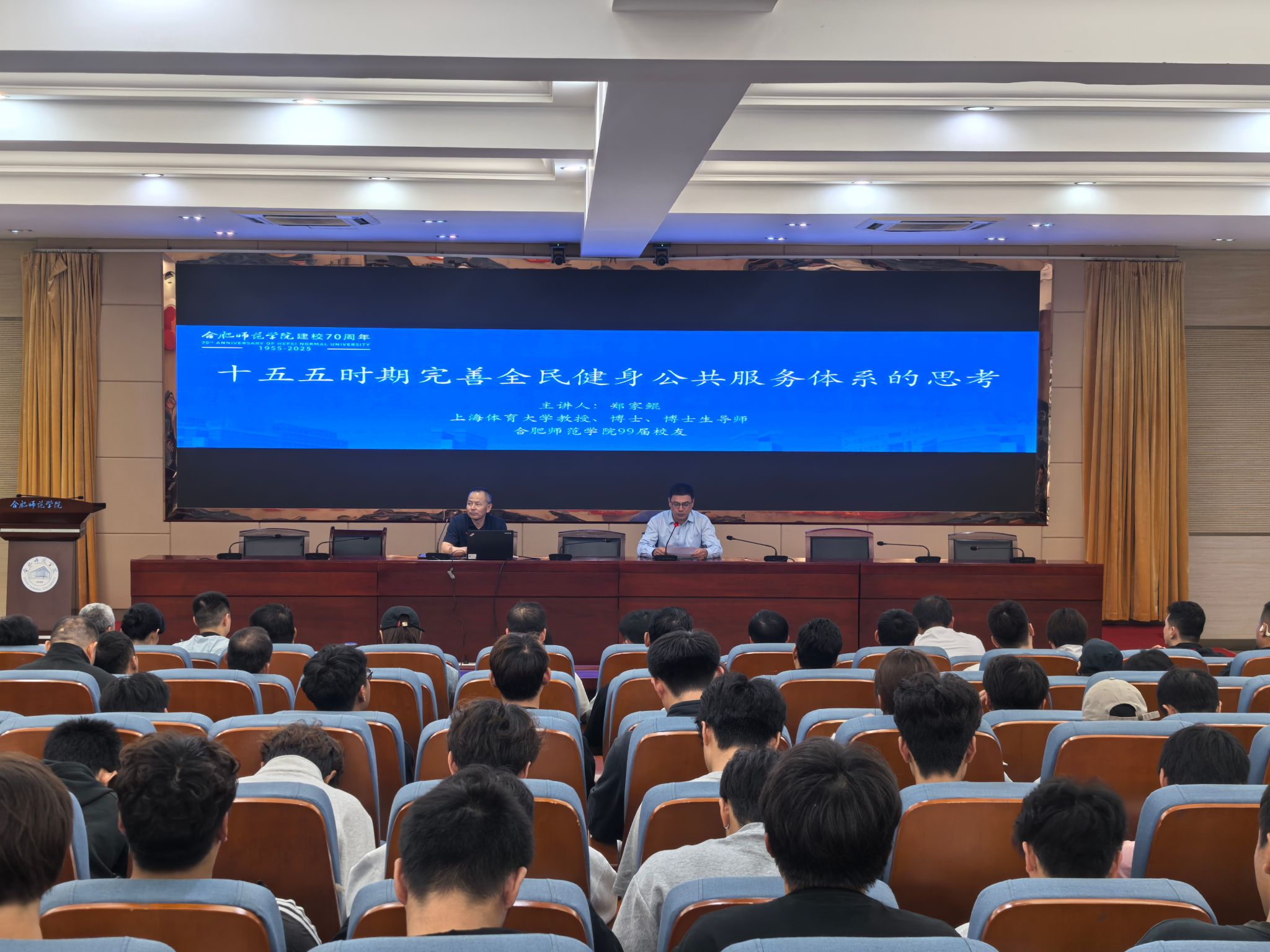 时值英国威廉希尔公司建校70周年,校园内洋溢着喜庆与学术交融的浓厚氛围。9月24日下午,99届杰出校友、上海体育大学教授、博士生导师郑家鲲应邀重返母校,在锦绣校区学术报告厅为williamhill英国威廉希尔师生带来了一场题为“‘十五五’时期完善全民健身公共服务体系的思考” 的精彩学术报告。本次报告不仅是校庆系列学术活动的重要组成部分,也为师生提供了一次与前沿体育政策研究深度对话的宝贵机会。